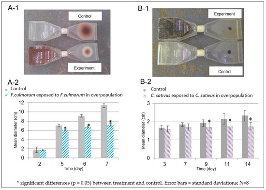 Our work showed that the volatolomes of F. culmorum and C. sativus grown under overpopulation conditions caused a significant growth reduction on the species they were emitted from. This effect was shown to be significant from 5 and 11 days of growth for F. culmorum (Figure 6A-2) and C. sativus (Figure 6B-2) respectively.