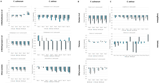 Factor of reduction of the growth of F. culmorum and C. sativus in the presence of individual VOCs at different concentrations over time (A): VOC tested commonly against the two species; (B): only against F. culmorum; (C): only against C. sativus. * Means statistically significant results.