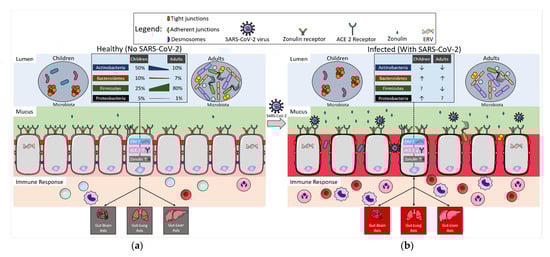 Comparison of mechanistic factors associated with the microbiome and SARS-CoV-2 response for children and adults. (a) Conditions associated with the gut microbiome and SARS-CoV-2 response are presented in the context of healthy children and adults. Maturation changes related to microbiome composition and bacterial diversity are demonstrated in the lumen portion. The epithelial cell barrier includes mechanistic differences in expression of angiotensin-converting enzyme II (ACE2) receptors and zonulin that can result in alterations to the immune response. In healthy conditions, children have more ACE2 receptors than healthy adults. Similarly, zonulin expression in healthy children is higher than in adults, but this is mostly reflected during the first two years of life. The impact of endogenous retrovirus (ERV) on the modulation of the gut microbiome and the immune response has not been tested yet, but it may be relevant in future studies. (b) Connections between the gut microbiome and SARS-CoV-2 response are shown for infected children and adults on the right side. Effects of the microbiome dysbiosis after infection with SARS-CoV-2 are highlighted, including the disruption of the epithelial cell barrier and bacterial translocation. These factors are correlated to the increases in zonulin and the decrease in ACE2 receptors observed during infection. The combination of the presented conditions and the potential role of ERV after infection could ultimately produce a greater inflammatory response. Overall, these important host-microbial events have implications for the health of other organ systems mediated through gut-axes.