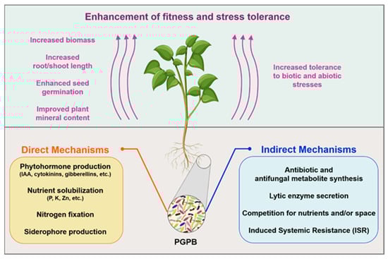 Plants are surrounded by a highly complex bacterial diversity, which is composed of different genera and species that can interact with the host plant in a neutral, harmful, or beneficial way. The beneficial bacteria are referred to as plant growth-promoting bacteria (PGPB) and include rhizospheric, epiphytic, and endophytic microorganisms living on/in the roots, shoots, leaves, flowers, and fruits. Members of various bacterial genera have been recognized for their plant growth-promoting features, including Bacillus, Paenibacillus, Pseudomonas, Rhizobium, Enterobacter, Serratia, Agrobacterium, Azospirillum, Azotobacter, Klebsiella, Burkholderia, Arthrobacter, Micrococcus, Microbacterium, and Rhodococcus [23]. PGPB modulate the overall plant fitness by increasing the plant biomass, enhancing nutrient availability, providing protection from phytopathogens, and promoting the tolerance to abiotic stresses (e.g., soil acidity/alkalinity, soil salinity, drought, flooding, low/high temperature, the presence of inorganic and organic pollutants in the soil, low nutrient bioavailability, and excessive radiation) [24,25,26,27]. In general, the mechanisms of plant growth promotion are categorized into direct and/or indirect (Figure 1). Direct mechanisms include the production of phytohormones and activities that increase the availability and uptake of nutrients, whereas indirect mechanisms consist of activities conferring protection against pathogens and tolerance to various abiotic stresses [8]. PGPB may use either direct or indirect mechanisms (or both), one or more mechanisms at the same time, as well as different mechanisms at different stages of host plant development [25]. A brief overview of some of the main mechanisms is outlined below and explained in Figure 1.
