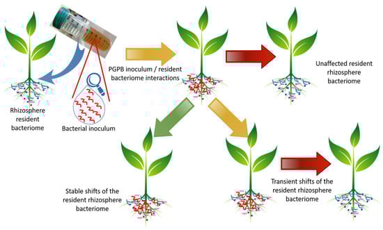 The release of bacterial strains in the environment is currently a quite common practice; it is used to clean up polluted soil, suppress soil borne diseases, promote plant growth, and restore biodiversity. As previously stated, the PGPB inoculation of plants exploits their beneficial effect on plant development and on ecosystem functions; this represents a sustainable solution for the reduced plant yield related to climate change [89]. However, once inoculated on a seed or on a plant, the PGPB, behaving as an invader, can potentially induce shifts in microbial communities, thus perturbing the niche previously created by the resident microbiota [90]. Once microbial invasion occurs, three main outcomes can be expected: (i) the invader can stably establish within the native microflora and then induce shifts in the microbial community composition, (ii) the resilience of the soil leads to the elimination of the invader and restores the initial condition, thus maintaining the community as it was before the invader’s arrival, and (iii) the invader can establish in the native microflora and then induce transient shifts in the microbial community composition followed by the restoration of the initial conditions (Figure 3) [91,92,93].