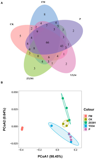 For β-diversity, the PCoA score plot based on the weighted UniFrac distance metric indicated that the individuals in FM, CK, and ZX301 treatments could be markedly separated from each other. In addition, the individuals in YX34 and P treatments were also clearly separated from other treatments. However, no evident difference between YX34 and P was observed (Figure 1B).