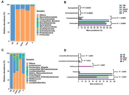 The bacterial community of FM and Stipa grandis on 60 days of ensiling (n = 3): (A) The bacterial community was shown at the phylum level. (B) The extended error bar plot displaying the significant differences among groups at the phylum level (C). The bacterial community was shown at the genus level. (D) The extended error bar plot displaying significant differences among groups at the genus level. Levels of significance are shown as follows: * p < 0.05; ** p < 0.01; **** p < 0.0001. FM, fresh matter; CK, control group; ZX301, pediococcus pentosaceus-treated group; YX34, lactobacillus planturum-treated group; P, a commercial inoculant-treated group containing lactobacillus plantarum.