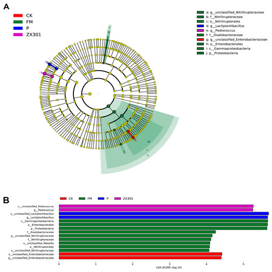 The LEfSe analysis was used to reflect the variations of bacteria that most likely explained the differences in bacterial community structures of fresh Stipa grandis and after Stipa grandis silage (LDA score > 4.0). As shown in Figure 3, the results revealed that the fresh Stipa grandis before ensiling had various bacteria, but the types of bacteria were decreased after ensiling, with the FM treatment exhibiting a high abundance of unclassified_Nitriliruptoraceae, CK treatment exhibiting a high abundance of unclassified_Enterobacteriaceae, ZX301 treatment exhibiting a high abundance of Pediococcus, and P treatment exhibiting a high abundance of Lactiplantibacillus, at the genus level, respectively.