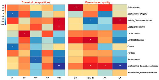 Heatmaps of Pearson’s correlations between dominant genera and chemical compositions and fermentation quality. Red represents a positive correlation, while blue represents a negative correlation. Levels of significance are shown as follows: * p < 0.05; ** p < 0.01.