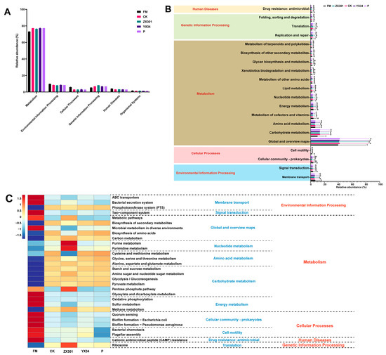 Notably, the main predicted functional genes at level 1 in the five treatments were assigned to metabolism (73.09−77.37%), genetic information processing (7.90−9.83%), and environmental information processing (5.30−8.09%), respectively (Figure 5A). Among these, the relative abundance of global and overview maps (41.55%), carbohydrate metabolism (12.87%), amino acid metabolism (6.65%), and membrane transport (6.03%) accounted for more than 5% of the enriched pathways among the five treatments (Figure 5B). At the three levels (Figure 5C), the genus associated with ABC transporters, bacterial secretion system, two-component system, metabolic pathways, microbial metabolism in diverse environments, glyoxylate and dicarboxylate metabolism, oxidative phosphorylation, sulfur metabolism, methane metabolism, quorum sensing, biofilm formation-Escherichia coli, biofilm formation-Pseudomonas aeruginosa, bacterial chemotaxis, flagellar assembly, and cationic antimicrobial peptide resistance was remarkably (p < 0.05) enriched in the FM treatment. The genus associated with purine metabolism, pyrimidine metabolism, and ribosome was remarkably (p < 0.05) enriched in the ZX301 treatment.
