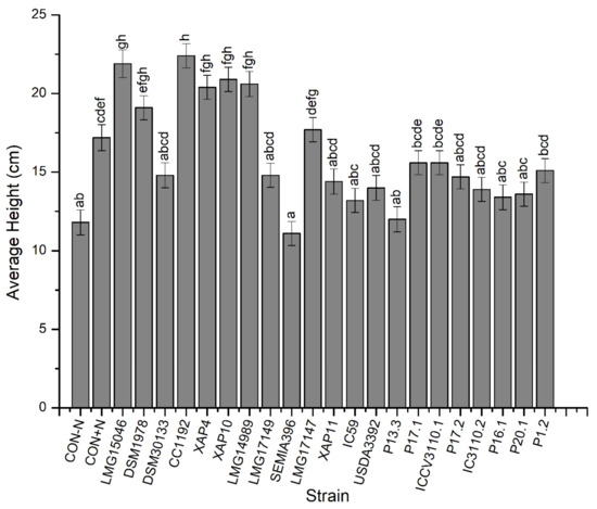 The results of the IAA production indicated that all the strains considered were positive, but the amount produced varied across the strains tested (Table 4). Following Brigido et al. [34], the level of IAA production was denoted as low production (LP, <15 µgml−1), medium production (MP, 15–30 µgmL−1), high production (HP, 31–45 µgmL−1), and very high production (VHP, >45 µgmL−1). Accordingly, the commercial strain (IC59), produced the highest amount of IAA, while LMG17149 produced the lowest. Overall, one strain (LMG17149) was categorized as LP, one strain (XAP11) as MP, and two strains (LMG17147 and USDA3392) as HP. The rest of the strains, including the Mpumalanga isolates, were categorized as VHP (Table 4).