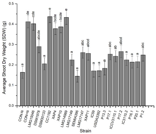 For SDW, strains CC1192 and LMG14989 performed significantly better than strains DSM30133, LMG17149, SEMIA396, LMG17147, XAP11, IC59, USDA3392, P13.3, P17.1, ICCV3110.1, P17.2, IC3110.2, P16.1, P20.1, and the negative control (Figure 2) (p < 0.05). Measurements of SDW for plants inoculated with these two strains (i.e., CC1192 and LMG14989) were, however, not significantly different from those of plants inoculated with strains LMG15046, DSM1978, XAP10, XAP4, nor the positive control (p > 0.05) (Figure 2).