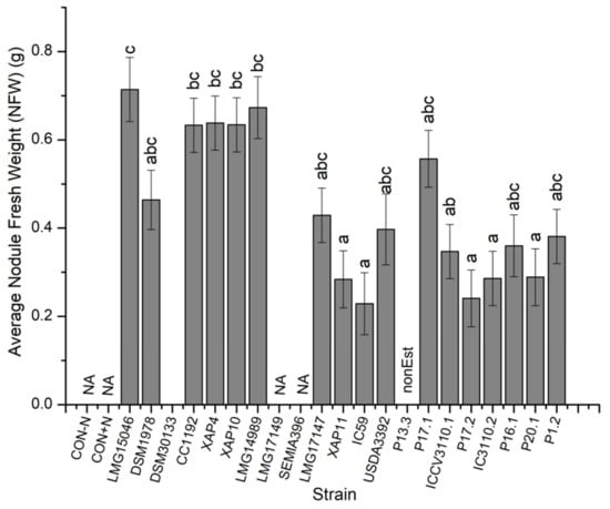 The graph of the effects of the Mesorhizobium isolate on nodule fresh weight (NFW) of chickpea. Bars are means ± standard errors, n = 3. Different letters (a–c) above the bars indicate treatments with significant differences (p < 0.05). NA = no nodules formed, nonEst = not estimated.