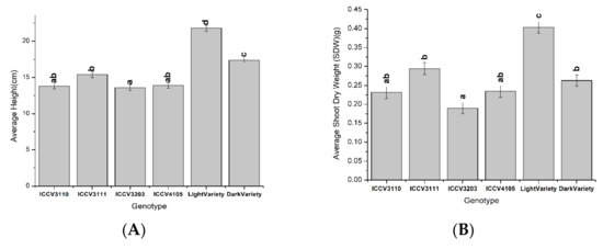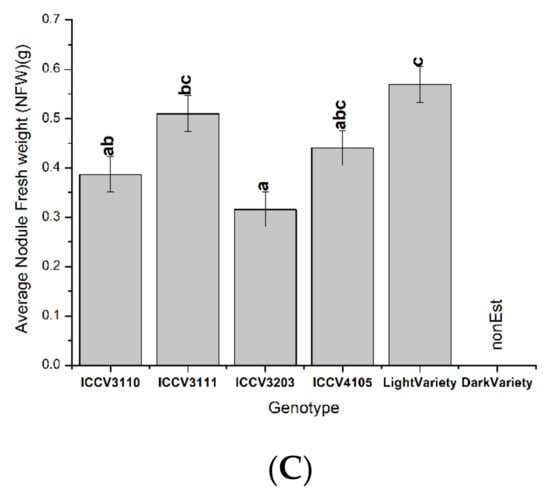 In terms of the effect of the chickpea genotype on the measurements recorded (Figure 4), the light variety generally showed higher performance than all the other genotypes, while the ICCV3203 genotype performed poorly. Among all genotypes, the light variety had significantly (p < 0.05) higher height and SDW values (Figure 4a,b), and the dark variety grew significantly (p < 0.05) higher than the four improved genotypes (Figure 4a). With regards to NFW (Figure 4c), the light variety and the ICCV3111 and ICCV4105 genotypes did not differ significantly (p > 0.05). The values for genotype ICCV3110 were also not significantly different from those of genotypes ICCV3111, ICCV3203, and ICCV4105 (p > 0.05). NFW values were not determined for the dark variety as it did not form nodules with strain P13.3.