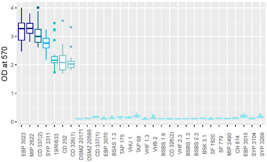 The high-throughput biofilm phenotypes of many species have been studied with CV assays. Eleven “well-defined biofilm production ability reference strains” [33], including Pseudomonas aeruginosa, Klebsiella pneumoniae, Ralstonia mannitolilytica, Staphylococcus aureus, and Staphylococcus epidermidis, were studied at 37 °C, following the same protocol as in the present study. None of these strains reached an OD = 2, whereas the B. thermosphacta biofilm producer strains of the present study showed a minimum OD of 2. Moreover, 143 Listeria monocytogenes strains cultured at 30 °C and 20 °C and 40 L. monocytogenes strains cultured at 37 °C for 72 h and stained with CV showed an OD < 2 [34,35]. This suggests a strong ability of a few B. thermosphacta isolates to produce biofilms compared to previously characterized bacterial species.