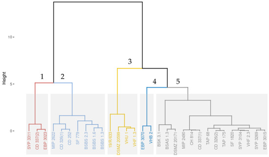 Hierarchical clustering on principal components (HCPC) dendrogram. Principal components were defined using principal component analysis (PCA) on the 74 BiofilmQ parameters extracted from confocal laser scanning microscopy (CLSM) images. Five clusters were identified based on the automatic cut tree of HCPC tool. Those clusters were numerated and colored as 1—red, 2—light blue, 3—yellow, 4—dark blue, and 5—grey.