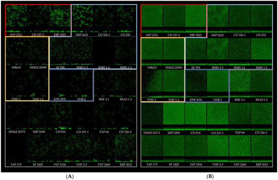 The 3D architecture and the spatial distribution of the biofilms formed by the thirty B. thermosphacta strains were examined by confocal laser scanning microscopy (CLSM). In the same way as in the CV staining assay, each strain was grown in BHI broth at 25 °C under shaking (150 rpm) overnight. The overnight culture was diluted 1/100 with BHI broth, then 200 µL of this cell culture dilution was transferred to 96-well polystyrene microtiter plates with a µClear base (Greiner Bio-One, Les Ulis, France). The microplates were incubated at 25 °C in static conditions. After 2 h (early biofilm) or 24 h (mature biofilm), the biofilms were labeled with Syto 9 (5 µM), a cell-permeant nucleic acid maker. Images were acquired on a Leica SP8 equipped with a ×63 APO water objective at the MIMA2 microscopy platform (https://www6.jouy.inrae.fr/mima2, accessed on 12 October 2022). The Syto 9-labeled bacteria were excited at 488 nm, and the emitted fluorescence was collected in the 500–550 nm range. Two fields of each well were scanned with a z-step of 1 µm, and each strain was grown in three wells considered as independent technical replicates. Two independent biological replicates were performed for a total of 12 z-image-series per strain. BiofilmQ [43] was used to extract quantitative biofilm parameters (Supplementary Figures S2–S5).