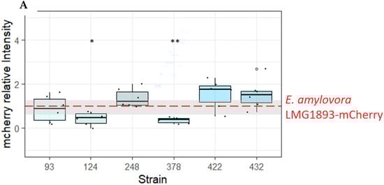 In addition, persistence of E. amylovora LMG1893-mCherry inside the inoculation sites was evaluated by fluorescence measurement. The observed red fluorescence was significantly lower when E. amylovora LMG1893-mCherry was co-inoculated with OGBa #124 or P. agglomerans #378, compared to inoculation with E. amylovora LMG1893-mCherry alone, (p < 0.0143 and p < 0.0041, respectively, from a paired t-test) (Figure 2A). The mCherry signal was only detected at the inoculation site, and no further spread of E. amylovora LMG1893-mCherry through the apple tissue was observed.