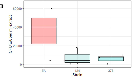 Isolates active against E. amylovora in an apple model of infection. (A) Strains OGBa #124 and P. agglomerans #378 antagonized E. amylovora LMG1893-mCherry in the apple model of infection. The intensity of mCherry in the apple model was measured for E. amylovora LMG1893-mCherry mixed with strains #93, #124, #248, #378, #422, or #432 and compared to mCherry intensity for the E. amylovora LMG1893-mCherry single strain inoculant (red line). **, p < 0.01; * p < 0.05 very significant compared to E. amylovora LMG1893-mCherry single inoculant with p < 0.001(paired t-test). Mean and interquartile range are indicated by bold line and box, respectively. (B) Strains OGBa #124 and P. agglomerans #378 reduced E. amylovora CFUs after 2.5 weeks of incubation. Bacteria were re-isolated from apple model inoculation sites after 17 days at 26 °C, and CFUs of E. amylovora LMG1893-mCherry were counted for apples inoculated with E. amylovora LMG1893-mCherry only (EA) and for the mixtures with strains #124 or #378. Mean and interquartile range are indicated by bold line and box, respectively.
