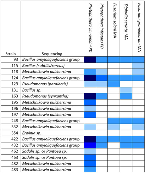 Most of the active isolates were found to belong to the OGBa or to be fungi of the species Metschnikowia pulcherrima. Many strains that were found to be active against P. cinnamomi did not show inhibitory activity against P. infestans. OGBa strain #124 showed particularly promising activity in these tests, suggesting that its biocontrol activity might extend to other uses beyond the control of fire blight.