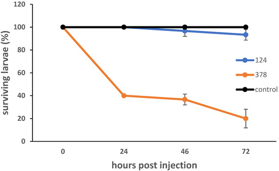 Survival curves for G. mellonella larvae infected with strains B. velezensis #124 and P. agglomerans #378. Larvae were injected with approximately 5 × 105 bacteria and incubated at 30 °C in the dark. Live and dead larvae were counted at 24, 48 and 72 h p.i. Curves represent the mean of three separate experiments. Error bars represent the standard deviation of the data.