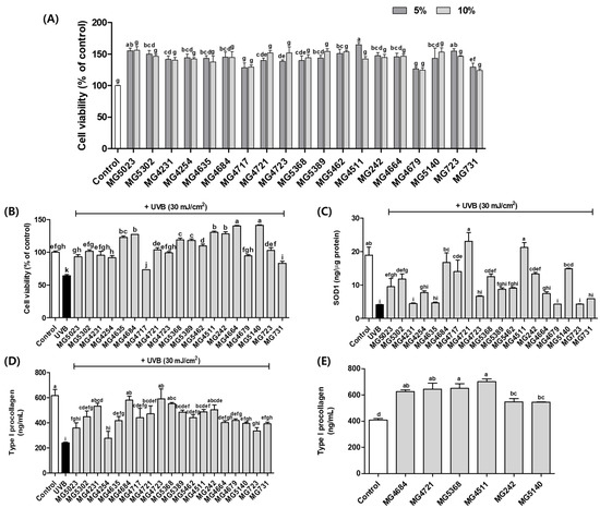 3.2. CFS of LAB Improves SOD Enzyme and Type I Procollagen Levels in UVB-Exposed Hs68 Cells
