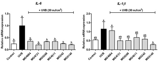 3.3. CFS of LAB Inhibits mRNA Expression of Proinflammatory Cytokines in UVB-Exposed Hs68 Cells