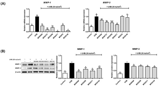 3.4. CFS of LAB Inhibits mRNA and Protein Expression of MMP-1 and MMP-3 in UVB-Exposed Hs68 Cells