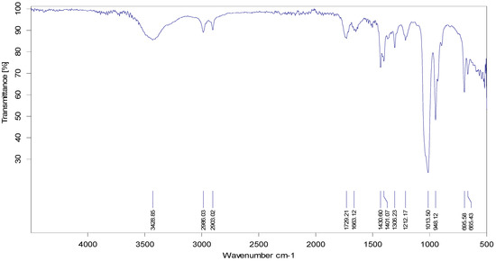 Functional groups of P. betle extract were characterized by FTIR analysis, and the major peaks of absorption (3428.85, 2986.03, 2903.02, 1729.21, 1663.12, 1430.60, 1401.07, 1306.23, 1212.17, 1013.51, 948.19, 695.58, and 665.43 cm−1) were identified and characterized according to the nature of the phytochemical compounds present in the extract (Figure 3).