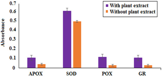 The quantification of antioxidative enzymes was carried out in the presence of P. betle chloroform extract. In B. gaemokensis, expression of SOD, APOX, GR, and POX enzymes was seen to be elevated when cells were treated with the extract, as shown in detail in Figure 5.