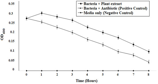 A decreasing trend in the growth of B. gaemokensis cells was demonstrated with P. betle extract, which was found comparable with the antibiotic (positive control) (Figure 6), indicating that the extract effectively reduced the growth of the bacterium.