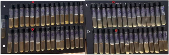 Bacterial strains inoculated in Luria Bertani (LB) broth (Row A), Tryptic Soy Broth (TSB) (Row B), LB + Sucrose (Row C), and LB + TSB (Row D). Control is shown in the tube at left side. Red arrows showing the B. gaemokensis growth in all four different growth media.
