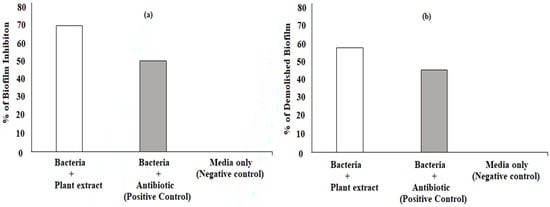 P. betle chloroform extract was observed to exhibit more inhibitory action (70.11%) on the biofilm formation of B. gaemokensis as compared to the antibiotic used (50.45%) (Figure 8a). In a similar fashion, P. betle extract, upon addition, was responsible for causing the demolition of established B. gaemokensis biofilm (57.98%), as shown in Figure 8b.