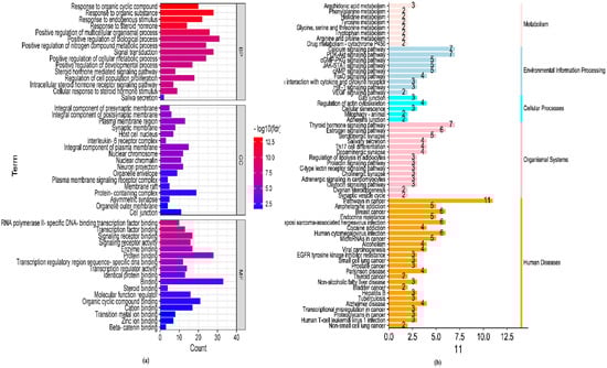 Enrichment analysis of (a) Gene Ontology (GO) terms and (b) KEGG pathways of P. betle extract for dental caries.
