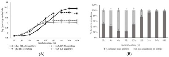 The growth (OD 600 nm) of B. adolescentis and R. hominis cultivated on glucose (10 g/L) as monocultures in the presence and absence of sodium acetate (5 g/L) indicated that, as expected, R. hominis is dependent on acetate [16], but B. adolescentis is not (Supplementary Figure S1). Further studies with B. adolescentis and R. hominis were carried out by using the medium for colon bacteria (MCB, without acetate) and a modified medium for colon bacteria (mMCB, with acetate), respectively. Coculture studies were carried out in the MCB medium. The cell concentrations of R. hominis and B. adolescentis were quantified by using strain-specific quantitative PCR (qPCR) targeting the rho gene (RHOM_RS09380) and recA gene (BAD_RS05455), respectively (Figure 1A; Supplementary Figure S2A and Table S2). The growth curve of either strain during the monoculture fermentation of glucose was different compared to coculture fermentation (Supplementary Figure S2A). In monocultures, the highest cell concentration for B. adolescentis and R. hominis was determined to be 11.4 ± 0.2 log units (rho copy number mL−1) and 10.9 ± 0.1 log units (recA copy number mL−1), respectively, after 16 h of incubation (Supplementary Figure S2A). However, during cocultivation, the highest cell concentration for B. adolescentis (10.3 ± 0.1 log units) and R. hominis (10.0 ± 0.1 log units) was observed after 12 h of fermentation (Supplementary Figure S2A), which was appreciably lower compared to monocultures. This potentially indicates competition for glucose between the two strains.