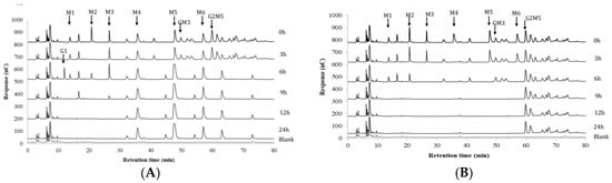 High-performance anion-exchange chromatography with pulsed amperometric detection (HPAEC–PAD) analysis of (galacto)-β-mannan-oligosaccharide (MOS/GMOS) utilization during the growth of (A) B. adolescentis, (B) R. hominis, (C) B. adolescentis, and R. hominis in coculture. The HPAEC–PAD analysis of the fermentation medium was carried out by using CarboPac PA200 column, as mentioned in Materials and Methods, in Section 2.11, Saccharide analysis by HPAEC–PAD. The elution was according to the previously described method optimized for fermentation media, as described previously in Bhattacharya et al. 2021 [16]. The arrows point to the retention time of galactose (G1), mannose (M1), linear mannan-oligosaccharides, MOS (mannobiose, M2, to mannohexaose, M6), and galactosylated mannan-oligosaccharides, GMOS (galactosyl mannotriose, GM3; di-glactosyl mannopentaose, G2M5) that have been used as standards in this study. All substrates were used at 5 g/L. An injection volume of 10 µL was used for all analytes.