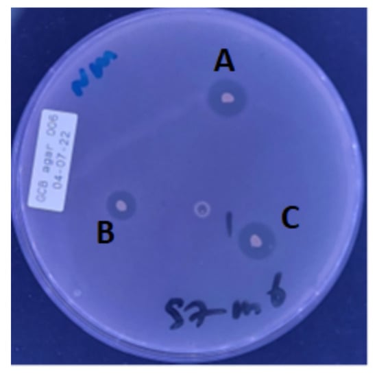 Agar overlay assay showing inhibitory activity by some isolates to N. meningitidis M00003/1: A, Rothia dentocariosa B, Streptococcus mitis and C, Rothia dentocariosa.