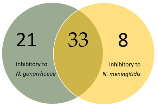 Furthermore, we wanted to elucidate whether the 62 isolates were inhibitory against N. gonorrhoeae or N. meningitidis or both pathogenic Neisseria species. Fifty-four isolates were inhibitory to N. gonorrhoeae, 41 to N. meningitidis and 33 were inhibitory to both pathogenic Neisseria species (Figure 2).