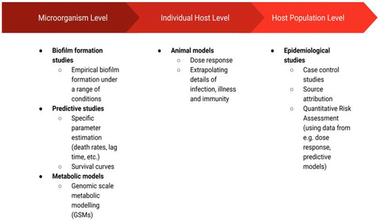 The studies that have been applied in C. jejuni research may be grouped in terms of their resolution (Figure 1) as those that focus on the microorganisms themselves (i.e., biofilm formation studies, predictive studies, metabolic models), the individual host (animal models), or a population of hosts (epidemiological studies). The biofilm formation studies such as those discussed in this review can extrapolate commonly observed patterns, providing a general framework through which C. jejuni biofilms can be more easily controlled. Namely, these studies may inform the development of strategies inhibiting the survival of C. jejuni colonies in biofilms [14]. Predictive studies have been employed to improve food safety at various stages of production by determining whether C. jejuni is capable of growth or survival in given conditions (defined by temperature, pH, flow, etc.) and thus whether C. jejuni prevalence may cause a food safety issue in these conditions [15]. Metabolic modelling uncovers complex metabolic pathways and thus also cell–cell interactions [16]. Metabolic models are recognised for their usefulness in the biotechnology field, and they are applied for the design of new drugs and vaccines or the engineering of cells by changing their metabolism [17,18]. In the context of C. jejuni, these models have the potential to supplement microorganism-level research (i.e., predictive and biofilm formation studies) through their ability to predict cell physiology at the resolution of a single cell. Furthermore, metabolic models have the potential to help ease the disease burden caused by C. jejuni ingestion by their power to identify target proteins for drug or vaccine development [18] or by identifying factors that affect pathogen virulence [19]. This, in turn, could aid C. jejuni research on an individual host level. In particular, the identification of metabolic factors affecting virulence or the ability to colonise the host may motivate further case studies in which animal models are employed. These are the models in which animal subjects are used to study the disease in vivo [20]. Finally, assessment of C. jejuni incidence and disease data at a host population level through the use of epidemiological models has the potential to identify the most prominent sources of infection [3], factors affecting the severity of illness [21] or risk of post-infection complications [22], among many other useful possibilities.
