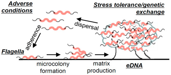 An extensive laboratory analysis, which identified the pillars of C. jejuni biofilm formation under static conditions, resulted in the development of a general description of C. jejuni biofilms [14]. For C. jejuni, adhesion is believed to be facilitated by flagella since aflagellate mutant strains have an impaired ability to attach to surfaces [14,23,26,27] unless the surface conditions are particularly favourable [28]. The study of Svensson et al. [14] additionally revealed an association of C. jejuni biofilm maturation with bacterial lysis, which was later confirmed in another study [29]. Confocal microscopy imaging of C. jejuni biofilms showed an abundance of eDNA present in mature biofilms, which has also been confirmed in another study, where additionally lipids, proteins, and polysaccharides were reported as other key constituents of the extracellular matrix [29]. Biofilm formation was significantly reduced in the presence of DNAse I; however, no significant difference in surface attachment was observed, indicating that eDNA is not necessary for the attachment of C. jejuni to surfaces. On the other hand, in the conditions for which eDNA release and biofilm formation were enhanced (MHB with sodium deoxycholate), horizontal gene transfer, manifesting through the recovery of colonies exhibiting combined antibiotic resistance of two parental strains that initiated the formation of the biofilm, was found to be increased. This property has also been later confirmed in another study [30]. A replica of the model built on the collection of experimental evidence gathered by Svensson et al. [14] on C. jejuni biofilms can be found in Figure 3. In summary, the study concluded that the biofilm formation of C. jejuni may be triggered by adverse environmental conditions, and initial attachment is facilitated by flagella. Furthermore, as the biofilm matures, an abundance of eDNA is released, with evidence suggesting that this release is in significant part due to a lytic process. Finally, the study presented evidence of increased stress tolerance and horizontal gene exchange in well-formed biofilms, which exhibited an abundance of eDNA [14].