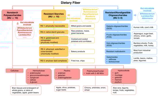 Dietary fiber can be obtained from diets as edible carbohydrate polymers naturally occurring in the food, or carbohydrate polymers extracted from food raw material by physical, enzymatic or chemical means, or synthetic carbohydrate polymers having a physiological effect of benefit to health [9]. As shown in Figure 1, dietary fiber can be classified into three types based on the physiological properties of their MU polymerization: 1) nonstarch polysaccharides (NSPs) (MU ≥ 10); 2) resistant starches (RS) (MU ≥ 10), and 3) resistant/nondigestible oligosaccharides (ROS) (MU: 3–9) [13,14]. The NSPs mainly include cellulose, hemicellulose, pectins, inulin, and various hydrocolloids [15,16]. Inulin is a fructan containing 2–60 fructose units. When MU <10, inulin is also recognized as fructo-oligosaccharides (FOS) [17], well-documented prebiotics [14]. RS can be further classified into RS 1 to RS 5, which can be derived from milled grains and seeds (RS 1), raw potatoes, maize and green bananas (RS 2), cooked and cooled potatoes and cornflakes (RS 3), bakery products (RS 4) and fried rice chips (RS 5) [18]. ROS consist of 3–9 MUs, many of which were named after polymerized monosaccharides, such as galacto-oligosaccharides (GOS), xylo-oligosaccharides (XOS), and galactosides [19].