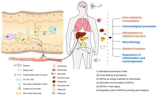 Dietary fiber is a carbohydrate in plant foods, such as whole grains, vegetables, fruit, and legumes, which have been dominant in human diets for millions of years. From the Paleolithic era, when the hunter-gatherers mainly ate fruit and wild grains, to the agricultural era, when crops began to be cultivated, the ancients consumed more than 100 g of various digestible and indigestible dietary fiber from plants per day [1,2]. During the million years, the human gut microbiota has provided vital nutritional services through digesting lactose and cellulose, degrading toxins, and biosynthesizing vitamins, signal molecules, and other essential substances [3].