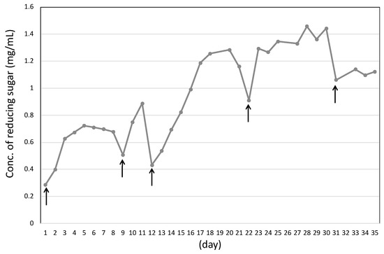 Measurement of reducing sugar in the culture supernatant of C. cellulovorans with shredded paper. Arrows indicate where the shredded paper was added after it was completely degraded.