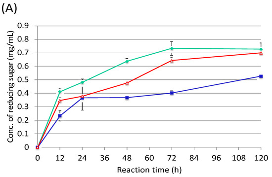Enzymatic activities of rice straw (A) and sugarcane bagasse (B) using each purified cellulosome. Red line, cellobiose cellulosome; green line, rice straw cellulosome; blue line, sugarcane baggase cellulosome.