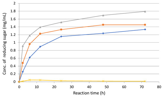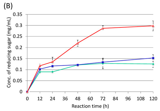 We pretreated 2% (w/v) sugarcane bagasse using a wet jet milling device under 200 MPa (Star Bust®, SUGINO Machine Ltd., Toyama, Japan) from 1 to 30 passes (Figure 1). The reaction mixture consisted of 6 mL of enzyme solution cultivated with untreated or treated sugarcane bagasse and cellobiose, 10 mL of 5% sugarcane bagasse without pretreatment, 4 mL of 250 mM acetate buffer (pH 6.0), 0.16 mL of 10 mg/mL tetracycline solution (Sigma-Aldrich No. T7660, Tokyo, Japan) in 70% ethanol and 0.12 mL of 10 mg/mL cycloheximide solution (Sigma-Aldrich No. C1988, Tokyo, Japan) in distilled water. The mixture was incubated at 37 °C, and then the reducing sugar as D-glucose was measured using the DNS method. The data represent at least three independent experiments.