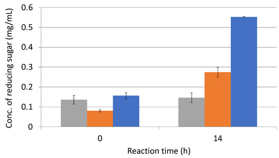 Next, the enzyme reaction was performed with 5% (w/v) sugarcane bagasse treated with 30 passes as a substrate at 37 °C, together with 200 rpm rotation admixture. As the result of reducing sugar measurement, enzyme solution from cellobiose supernatant (E3) was most active and the final activity had 1.4-times higher than that of pretreated sugarcane bagasse supernatant (E1) (Figure 7). In contract, the enzyme solution of untreated sugarcane bagasse supernatant (E2) was a little active than that of the treated one. As shown in Table 2, specific activity (38.2 mU/mg) in E2 was higher than those in E1 (27.9 mU/mg) and E3 (28.0 mU/mg), respectively.