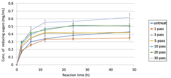 Degradative activities of untreated and 1- to 30-pass-treated sugarcane bagasse using E3 with 10 mM L-cysteine. 2% (w/v) sugarcane bagasse was pretreated by the wet jet milling device. After the pretreatment from 1 to 30 passes with the device or without it, all samples were used as a substrate for enzymatic reaction. D-Glucose was used as a standard curve for reducing sugars. Each line indicates each treatment.