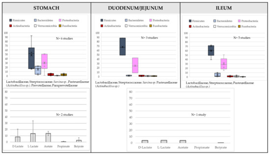| [89] | 28 horses showing signs of colic into two study groups: horses with large intestinal colic (LC, n = 20) and horses with small intestinal colic (SC, n = 8). 24 clinically healthy adult horses. All horses were thoroughbreds | Fecal samples at D0 (admission) Amplicon sequencing of the V3-V4 region | ↓ number species observed and Shannon index in horses with large intestine colic | Significant difference between control, large colon and small intestine colic horses | Horses with small intestine colic: ↑ Firmicutes, ↓ Methanobacteriaceae and subdivision 5 Verrucomicrobia. LEfSe: ↑ Enterococcus, Lactobacillus, Acinetobacter, Bifidobacterium, Kurthia, Weissella, Rummeliibacillus, ↓ Methanobrevibacter, Coprococcus, Faecalitalea, Treponema, Akkermansia Horses with large intestine colic: ↑ Bacteroidetes, Lachnospiraceae, Streptococcaceae, Lactobacillaceae and Coriobacteriaceae, ↓ Verrucomicrobia. LEfSe: ↑ Enterococcus, Acinetobacter, Lactobacillus, E.coli/Shigella, Blautia, ↓ Methanobrevibacter, Unclassified bacteria Verrucomicrobia |