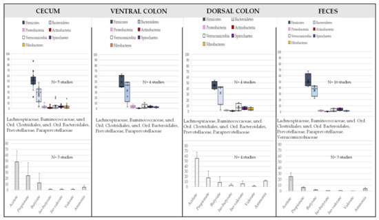 | [18] | 35 Welsh-section A ponies mares, 11 aged, 12 control and 12 obese. Glucose-insulin tolerance, digestibility evaluated in each phenotypic group. Controlled feeding, hay ration | Feces. Amplicon sequencing, V1-V2 regions, SCFAs, pH Metabolome (FT-IR spectroscopy) | Same copy numbers of bacteria, fungi and protozoa ↑ Shannon and Simpson index Beta-diversity: ≠ ↑ Bacteroidetes, Firmicutes and Actinobacteria, ↓ Fibrobacter, ↑ Pseudoflavonifractor ↑ fecal pH SCFAs: =, no change in fecal metabolome |