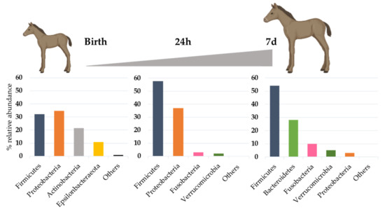 - Husso, A.; Jalanka, J.; Alipour, M.J.; Huhti, P.; Kareskoski, M.; Pessa-Morikawa, T.; Iivanainen, A.; Niku, M. The composition of the perinatal intestinal microbiota in horse. Sci. Rep. 2020, 10, 441. [Google Scholar] [CrossRef]