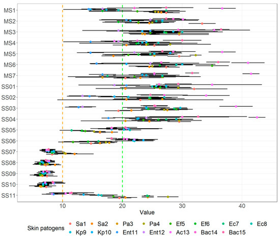 As noted in Table 1 and Table 2, all multi-strain dietary supplements MS1 to MS7 and single-strain supplements SS1 to SS4 contain different strains of lactobacilli. Eight strains of the modified Lactobacillus genus (MS1 to MS7), seven strains of the Lacticaseibacillus genus (MS1, MS2, MS3, MS4, MS5, MS7, SS01, SS02), three strains of Ligilactobacillus salivarius (MS1, MS2, MS3, MS5, MS7), three strains of Lactiplantibacillus plantarum (MS2, MS6, MS7, SS04), one strain of Levilactobacillus brevis (MS1, MS5) and one strain of Limosilactobacillus reuteri in SS03. The bifidobacteria genus is included in eight samples: MS1, MS2, MS3, MS5, MS6, MS7, SS05, and SS06. All eight samples include strains of the species Bifidobacterium animalis that contains two subspecies: B. animalis subsp. lactis and B. animalis subsp. animalis. Two strains of Bifidobacterium breve W25, PXN 25 and two strains of Bifidobacterium longum W108, PXN 30 in MS5, and MS7, one strain of Bifidobacterium bifidum W23 in MS1, MS2, MS5, and MS7 and one strain of Bifidobacterium infantis in MS7. Three lactococci strains were included in MS1, MS2, MS3, MS5, and MS7. Three propionibacteria strains are included in SS08, SS09, and SS10, [41]. One strain of each of the following bacteria are also included: Enterococcus faecium in MS3, Bacillus subtilis PXN 21 in MS7, Bacillus coagulans MTCC 5260 in SS07, and Streptococcus thermophilus in PXN 66 MS7. Saccharomyces cerevisiae var. boulardii is included in MS6 and SS11. The clinical pathogens were selected from the bacterial strains isolated from the wound samples received at the Institute of Microbiology and immunology at the Faculty of Medicine, University of Ljubljana, Slovenia in 2021. The genera/or species and origin are noted in Table 3.