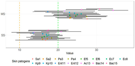 The antimicrobial effect of the chosen single-strain and multi-strain dietary supplements, probiotics, or other beneficial microbes against common skin or wound pathogens was determined using the modified agar spot assay [55,56,57]. Briefly, each probiotic overnight culture with a final concentration (108 cfu/mL) was inoculated as spots onto the following media: De Man, Rogosa, and Sharpe agar (Millipore, 1.10660) for all multi-strain probiotics and SS01-SS04, TOS-propionate agar (Sigma-Aldrich, 43314) for SS05 and SS06, Mannitol Egg Yolk Polymyxin agar (Merck, 1.05267) for SS07, Clostridium perfrigens agar (Liofilchen, 610207) for SS08-SS10, and Sabouraud glucose agar (BioMerieux, AEB152202) for SS11.