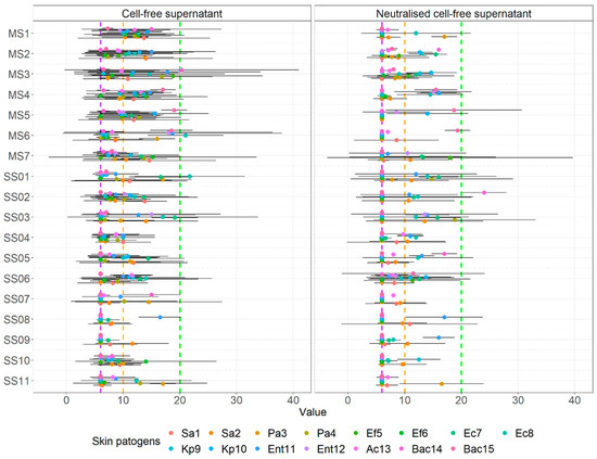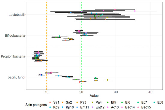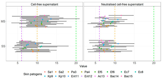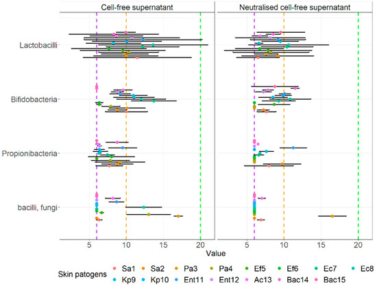 Below are the results of the mean zone of inhibition for all investigated cell-free supernatants (S) (Table 10) and neutralized cell-free supernatants (NS) (Table 10) of probiotics and other beneficial microbes against the clinical pathogens, isolated from various skin wounds. Exact values of inhibition zones and standard deviation are noted in Supplementary Tables S3 and S4.