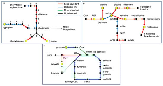 Metabolic pathway that includes proteins present at non-wild-type levels in ΔPor-1. Pathway details were obtained from KEGG pathways (https://www.genome.jp/kegg/pathway.html, accessed 21 November 2021, [44]) and only the segments of pathways that include proteins in relatively higher or lower amounts are shown for clarity. (a) Shikimate pathway and aromatic amino acid biosynthesis (KEGG pathways shikimate ncr00400 and sulfur amino acids ncr00920, respectively). Intermediates are as follows: panel A: a: 7-phospho-2-dehydro-3-deoxy-D-arabino-heptonate; b: 3-dehydroxyquinate; c: 3-dehydroshikamate; d: shikimate 3-phosphate; e: 5-O-(1-carboxyvinyl)-3-phosphoshikamate; f: prephenate; g: 4-hydroxy-phenylpyruvate; h: phenylpyruvate; i: anthranilate; j: N-(5-phospho-β-D-ribosyl)-anthranilate; k: 1-(2-carboxyphenylamino)-1′-deoxy-D-ribulose-5-phosphate. (b) Amino acid biosynthesis (ncr00260, ncr00270) and sulfur metabolism (ncr00920) APS: adenosine 5′ phosphosulfate; PAPS: 3′ phosphoadenosine 5′ phosphosulfate: OAA: oxaloacetate; PEP, phosphoenolpyruvate (c) TCA cycle and pyruvate metabolism (ncr00020 and ncr00620) AcCoA: acetyl coenzyme A; ssaThPP: succinate semialdehyde thiamine diphosphate; sdhla: s-succinyldihydrolipoamide-E.